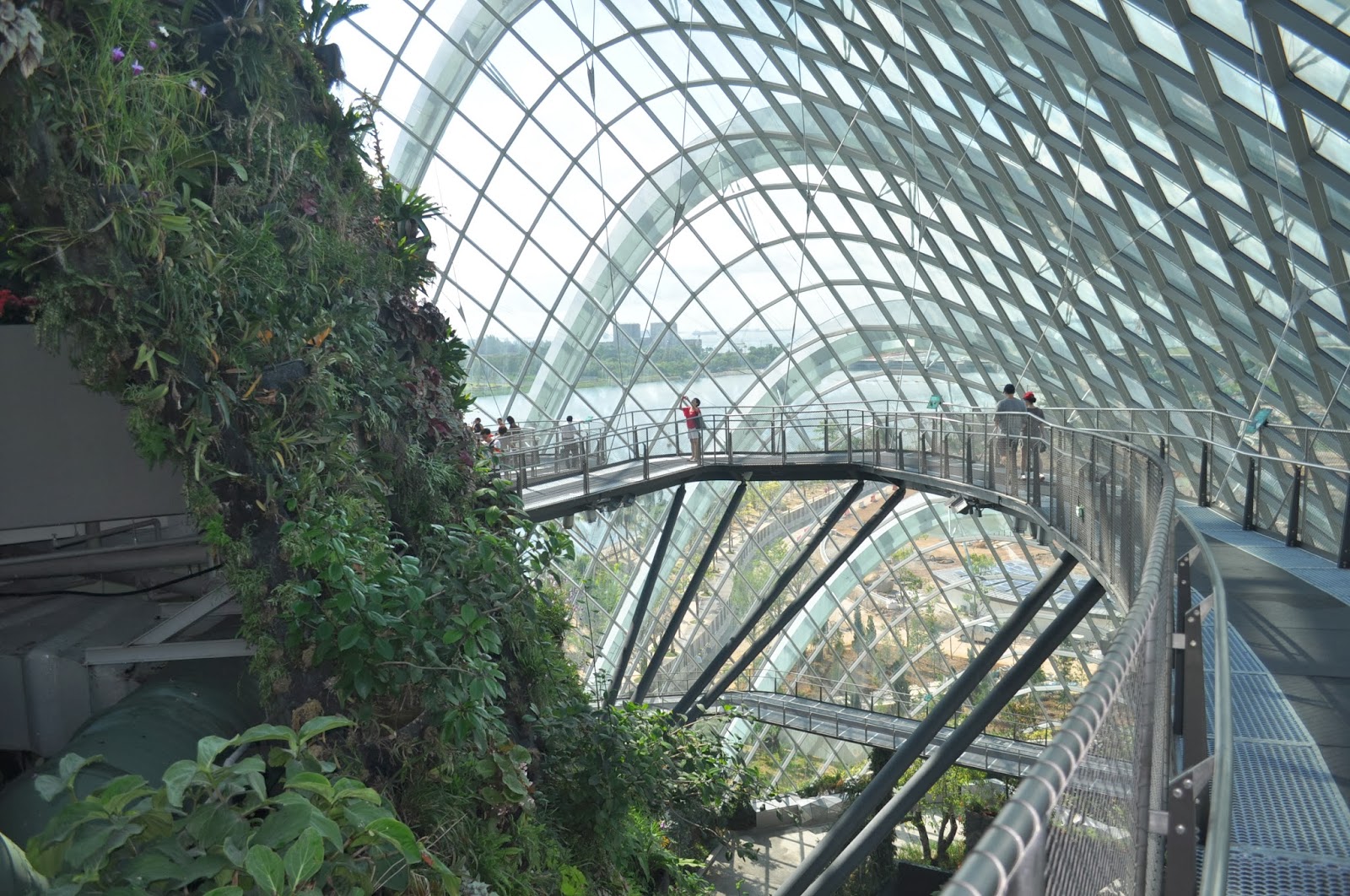Jeden z důvodů, proč se sem vrátit, jsou i Gardens by the Bay. Docela by mě zajímalo, jak se rozrostly. Když jsem připravovala náš itinerář pro Singapore, vůbec jsem o nich netušila a navštívili jsme je vlastně jaksi omylem. Během pobytu jsme se potkali s kamarádku známého - Nellie, která nás vzala na místní speciality a mimo jiné nám i doporučovala, co vidět. A protože poslední den jsme letěli domů až hluboko v noci, měli jsme vlastně jeden den navíc... a tak jsme se vydali do novodobých zahrad královny Semiramis :-) A jenom koukali! Zpětně jsme si na novinkách přečetli, že v centru města vyrostly obří betonové stromy a celá zahrada byla otevřena pro veřejnost 29.6.2012. No abychom o ní věděli! :-) Na naší vstupence je datum 21.7.2012, tak to byla opravdu turistická novinka. Konstrukcí je (bylo) celkem 11 a jejich výška se pohybuje mezi 25 a 50 metry a nesou 200 druhů rostlin - převážně z lokací jako je Brazílie, Panama nebo Kostarika. V době naší návštěvy byly otevřeny dva obří skleníky Flower a Cloud Forest Dome, kde se platilo vstupné (stálo to ovšem za to), jinak samotná zahrada je pro návštěvníky zdarma. Vzhledem k tomu, že Singapore leží skoro na rovníku, vedro je tu opravdu velké, takže návštěva klimatizovaných skleněných kopulí je více než příjemná záležitost a my si náš poslední den krásně užili.
