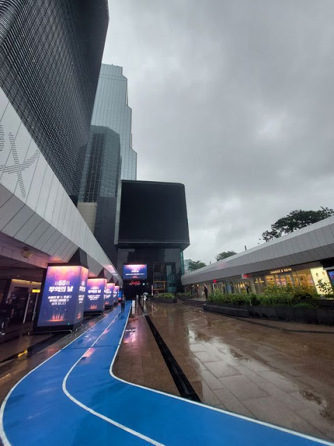 To, že pořád pršelo, nás přesvědčilo k tomu, že jsme se rozhodli po akváriu v obchoďáku zůstat a prošmejdili jsme si ho. Starfield COEX Mall byl původně otevřen v roce 2000 jako jeden z největších obchodních domů v Asii, poté byl rekonstruován a znovu otevřen v roce 2014. Je zde slavná knihovna Starfield, kterou najdete uprostřed COEX Central Plaza a nabízí návštěvníkům perfektní prostor pro čtení. Nachází se ve dvou patrech a má úctyhodné 13 metrů vysoké knihovny s více než 50 000 knihami k zapůjčení. No a před obchoďákem visí obří reklamní plazma...COEX Artium, u které jsme strávili hoooodně času 🙂 Plus hned vedle je socha Gangnam Style...